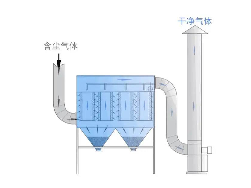 布袋除塵器的除塵效率與它的除塵機理是分不開(kāi)的。含塵氣體由除塵器下部進(jìn)氣管道,經(jīng)導流板進(jìn)入灰斗時(shí),由于導流板的碰撞和氣體速度的降低等作用,粗粒粉塵將落入灰斗中,其余細小顆粒粉塵隨氣體進(jìn)入濾袋室。由于濾料纖維及織物的慣性、擴散、阻隔、鉤掛、靜電等作用,粉塵被阻留在濾袋內,凈化后的氣體逸出袋外,經(jīng)排氣管排出。濾袋上的積灰用氣體逆洗法去除,清除下來(lái)的粉塵下到灰斗,經(jīng)雙層卸灰閥排到輸灰裝置。濾袋上的積灰也可以采用噴吹脈沖氣流的方法去除,從而達到清灰的目的,清除下來(lái)的粉塵由排灰裝置排走。